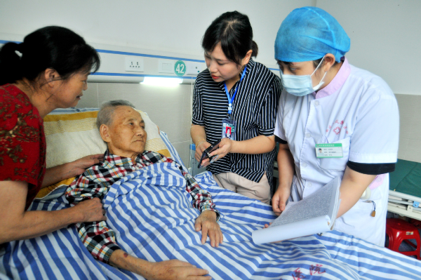 A community worker helps an elderly patient with online health insurance services at a hospital in Anqing, Anhui province, in July, 2020. [Photo by Huang Youan/For China Daily]