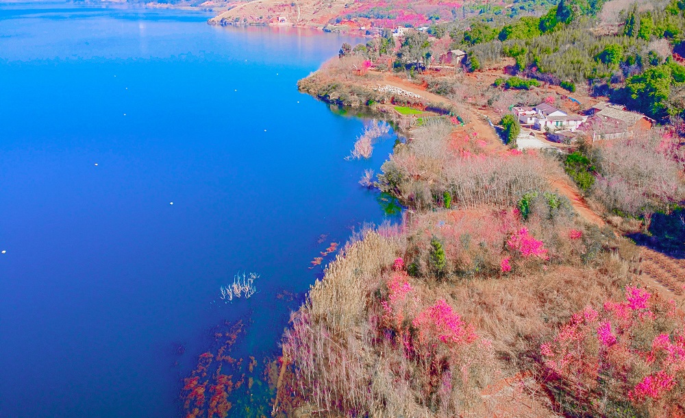 Winter cherry blossoms are blooming along Yangzonghai Lake in Kunming, Yunnan province! Embracing the warm climate, blue sky, white clouds, clear water and lush plants, it could well be your ideal place for a cozy winter tour!