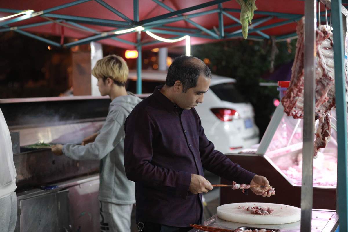 Turdimemet (right) prepares mutton barbecue at the couple's restaurant in Yichang, Hubei province. [Photo by Yan Xiaodong/ Provided to chinadaily.com.cn]