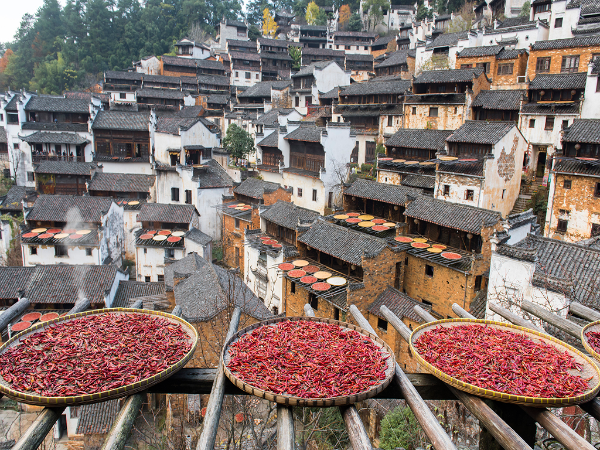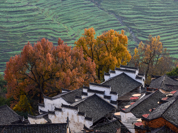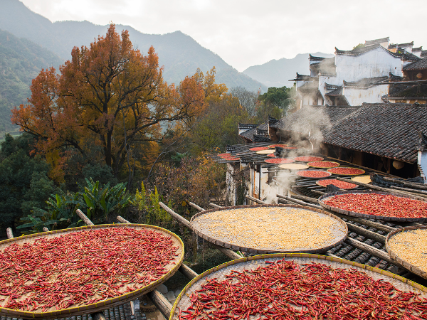 In Huangling village of Jiangwan town, East China’s Jiangxi province, the red maple leaves match very well with the Hui-style folk dwellings. Villagers are sun-drying their harvest on the roofs of their houses, creating a colorful rural landscape in the first days of winter.