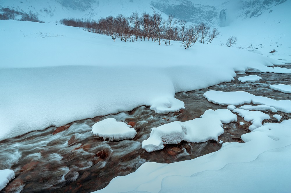 Let’s feast our eyes on a snowy wonderland, where we can appreciate not only marvelous mountain scenery, but also a breathtaking waterscape!