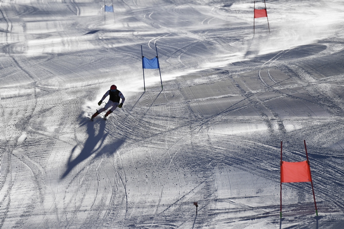 Skiers' tracks create geometric arcs across the course as a member of China's national alpine skiing team races downhill during training at Zhangjiakou's Changchengling Ski Resort in North China's Hebei province, on Dec 20, 2020. [Photo by Wei Xiaohao/chinadaily.com.cn]