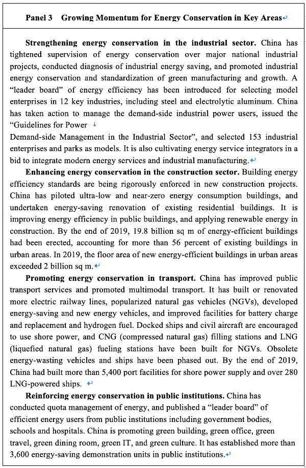– One reform to improve the energy consumption structure by containing unnecessary consumption. China is determined to carry out the principle of prioritizing energy conservation, and has tightened the control of total energy consumption and energy use intensity, and enforced energy conservation in all areas of social and economic development. It resolves to adjust its industrial structure. It emphasizes energy conservation in the process of urbanization, and works to develop a green and low-carbon transport system. China encourages hard work and thrift and calls people to conserve energy and work and live with green energy, and move faster towards an energy-saving society.