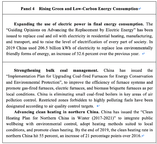 – Promoting a clean and low-carbon energy. China embraces the vision of harmonious coexistence between humanity and nature, directing its efforts towards clean and low-carbon energy. China promotes green energy production and consumption, and has improved the relevant structures accordingly. China is increasing the proportion of clean energy and non-fossil energy at the consumption stage, reducing carbon dioxide emissions and pollutant discharge by large margins, and working hard to accelerate its transformation towards green and low-carbon development for the Beautiful China initiative.