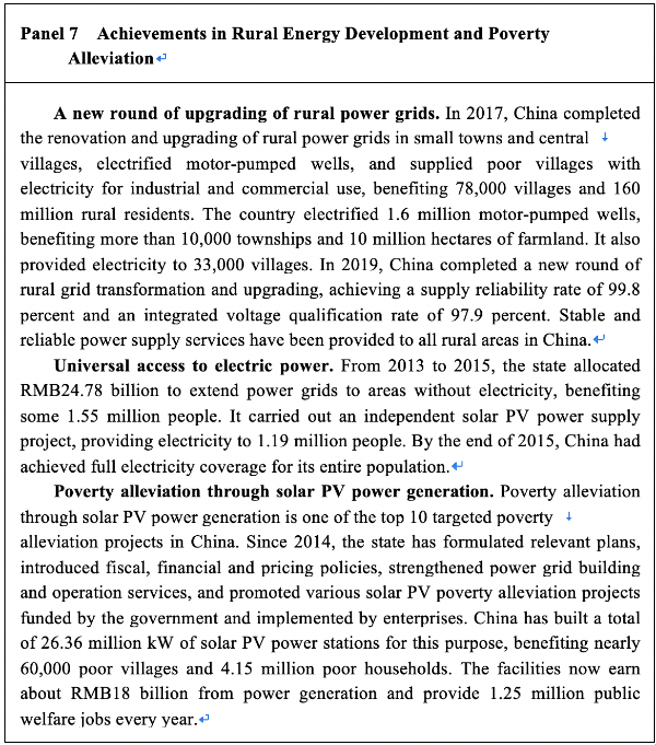 – Putting people first. China upholds the principle of energy development for the people, by the people and answerable to the people. Its primary goal is to ensure energy supply for people’s life and to ensure that the poverty-stricken population have access to electricity. To this end, China has been improving energy infrastructure related to people’s life and public services, and has integrated energy development with poverty eradication. China has launched programs on poverty reduction through energy support, which exemplify the fundamental role of energy supply, infrastructure and services in the battle against poverty.