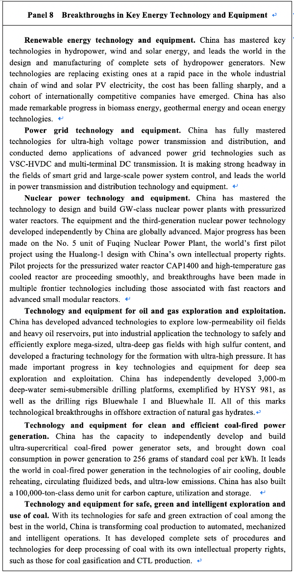 – One reform to improve energy technologies to upgrade the industry. China is implementing the innovation-driven development strategy, building a system that nurtures innovation in green energy technologies, and upgrading energy technologies and equipment in an all-round way. China has strengthened basic research on energy, innovation in generic and disruptive technologies, and original and integrated innovation. China has started to integrate digital, big-data and AI technologies with technologies for clean and efficient energy exploration and exploitation, with a focus on smart energy technologies, to turn these technologies and related industries into new growth drivers for industrial upgrading.