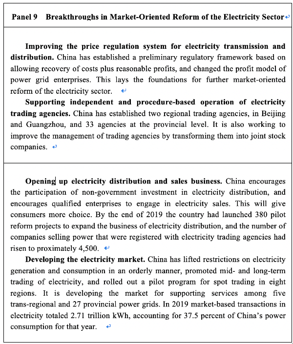 Following the principle of “allowing for more competition in electricity generation, sales and consumption while tightening government regulation of power grid, transmission and distribution”, China has lifted price control over competitive areas and links. The goal is to allow prices to reflect market demand, and thereby guide the allocation of resources. It has also conducted strict government oversight of the determination of pricing to cover reasonable costs.