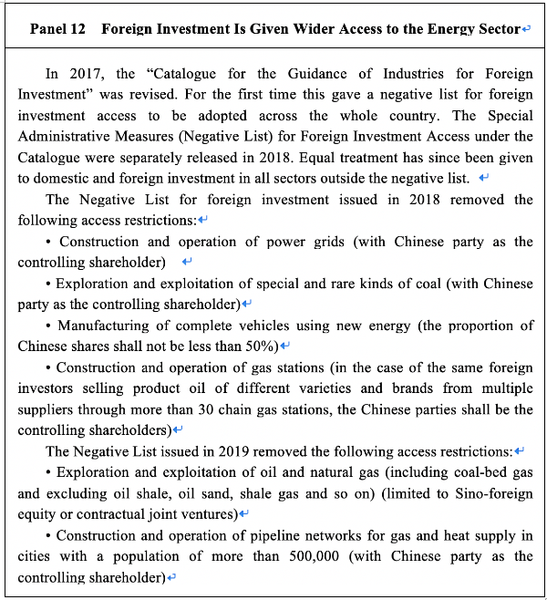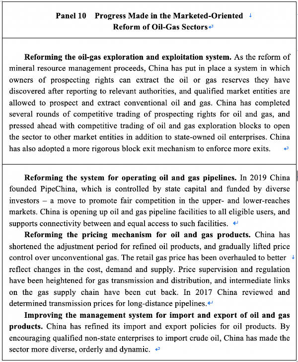 Diversifying market entities. China supports a variety of market entities to operate in segments of the energy sector that are not on the entry negative list, in accordance with the law and on equal footing. China has extended systemic reform of oil and gas exploration and exploitation and opened up the market in this regard. It has implemented competitive trading of oil and gas exploration blocks, and adopted a more rigorous exit mechanism for oil- and gas-bearing zones. China encourages qualified enterprises to import crude oil. It has reformed the oil and gas pipeline operation system to separate transport from sales. In an effort to reform electricity distribution, China is opening up electricity distribution and sales to non-government investment in an orderly manner, and is separating power grid enterprises’ secondary business from their core business. New market entities are being cultivated in the fields of electricity distribution and sales, energy storage, and comprehensive energy services. Meanwhile China is extending reform of energy SOEs, supporting development of the non-public sector, and conducting active yet prudent mixed-ownership reform in the energy industry to boost the vitality and motivation of energy enterprises.