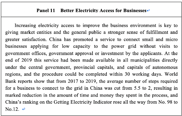 Igniting the vitality of market entities. China has extended reform in the energy sector to delegate powers, improve regulation, and upgrade services. This includes reducing approval by the central government for energy projects and delegating the approval power to local authorities for some projects. The requirement for government review and approval has been rescinded for energy projects about which market entities can decide at their own discretion. The number of items of preliminary review has been slashed and the threshold for market access has been lowered, while supervision during and after production has been enhanced and standardized. “Access to electricity” services have been improved. As a result the time, procedures and cost needed for businesses to connect to the power grid have all been cut down. In addition, China has promoted the “internet plus government services” model, and expanded the practice of providing all energy-related government services at one simple window in localities where all relevant authorities have outlets, thereby improving one-stop services.