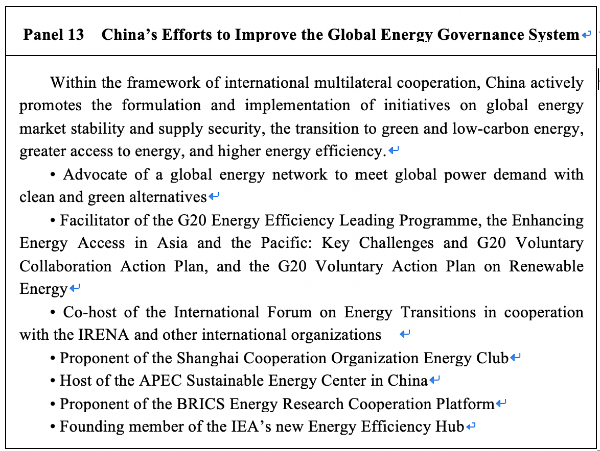 Engagement in multilateral energy governance. China is an active participant in international energy cooperation under multilateral mechanisms such as the UN, G20, APEC and BRICS. It is making positive progress in joint research, releasing reports and founding agencies. China has set up intergovernmental energy cooperation mechanisms with over 90 countries and regions, and established ties with over 30 international organizations and multilateral mechanisms in the energy sector. Since 2012, China has become a member state of the International Renewable Energy Agency (IRENA), an observer country to the Energy Charter Treaty, and an affiliate of the IEA.