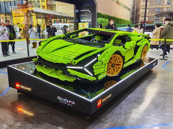 A 1:1 Lamborghini supercar model is displayed in a Lego flagship store in Nanjing, East China's Jiangsu province, on Dec 20, 2020. The car is made of 270,000 bricks. [Photo/VCG]