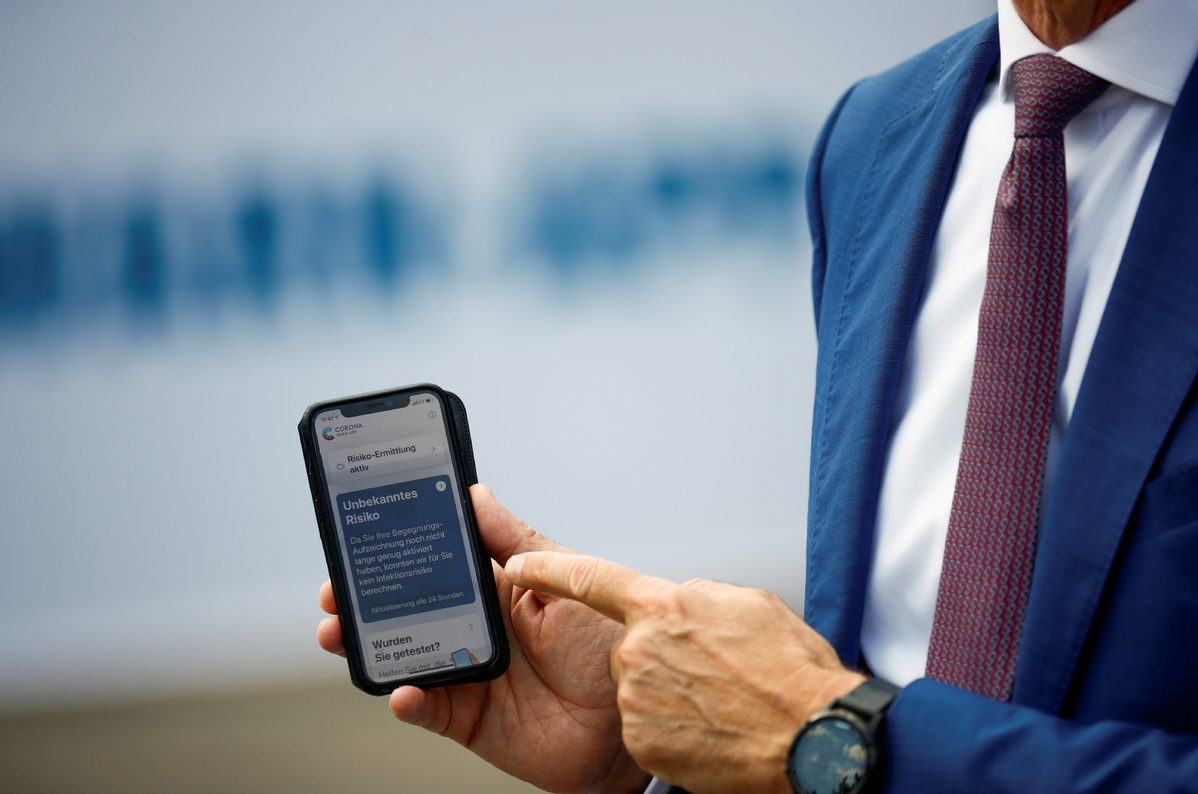 FILE PHOTO: A man holds a mobile phone with a contact-tracing app that will use Bluetooth short-range radio to alert people of the risk of infection with the coronavirus disease (COVID-19), in Berlin, Germany, June 16, 2020. [Photo/Agencies]