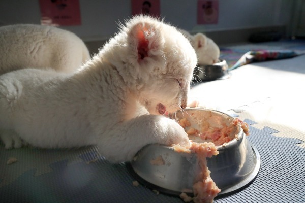 Another group of white lion quadruplets make their public debut at the Nantong Forest Safari Park in East China's Jiangsu province on Dec 21, following the first litter that were born earlier this year. [Photo/IC]