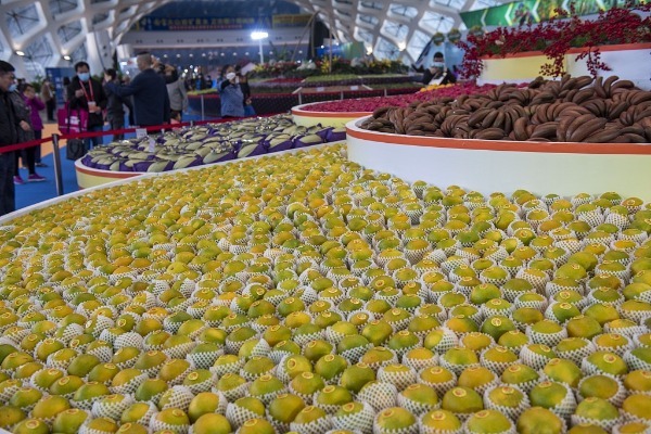 Vegetables, wine, coffee, aquatic and livestock products, and agricultural machines are exhibited at the 2020 (Hainan) International Winter Trade Fair for Tropical Agricultural Products earlier this month in Haikou, Hainan province. This year's trade fair features 10 exhibition areas and attracts 2,100 firms from 31 countries and regions. [Photo provided to China Daily]