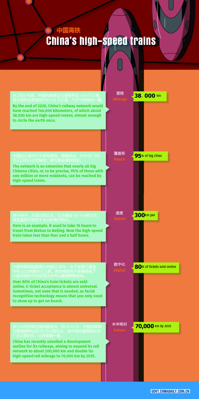 China has by far the world's largest high-speed railway network. Its total mileage, 38,000 kilometers by the end of 2020, is almost enough to circle the earth once.