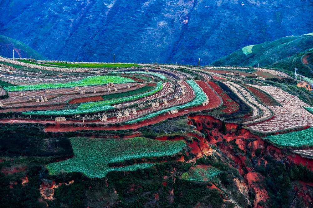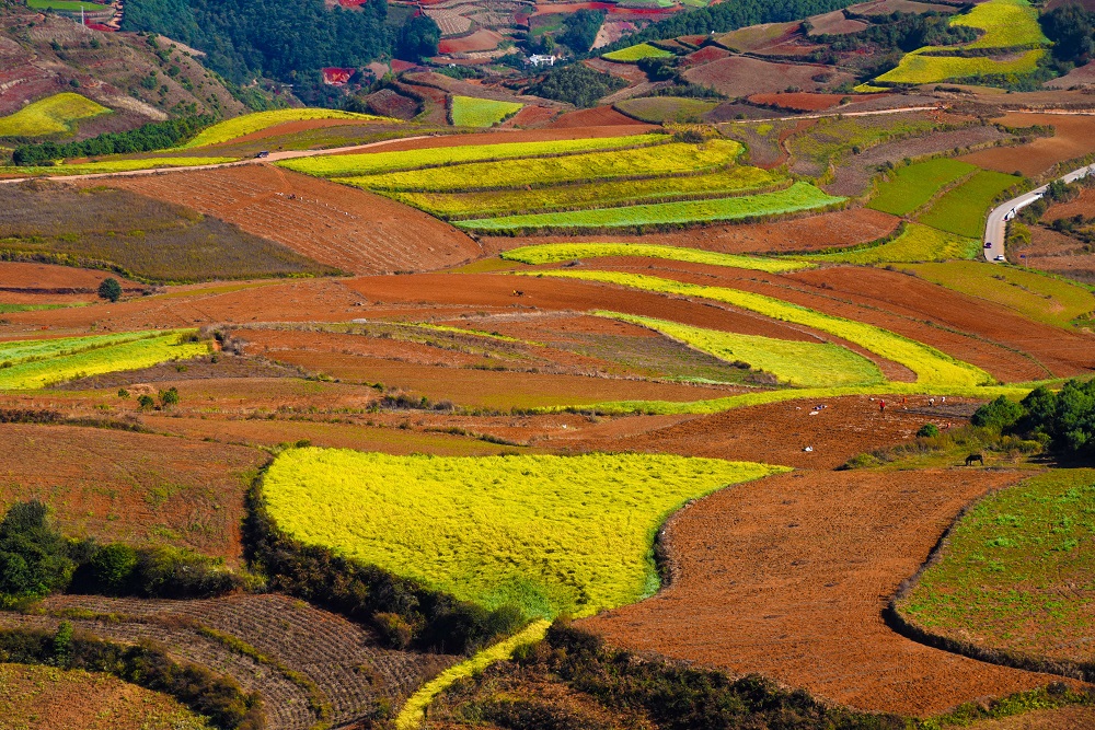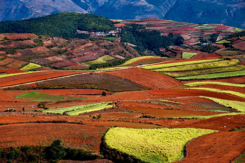 Featuring stunning red soil, the terraced fields in Dongchuan, Yunnan province, make up palette-like vistas. Let’s count how many colors they have!