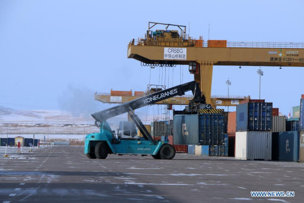 Photo taken on Jan 5, 2021 shows a crane carrying a container in Manzhouli, North China's Inner Mongolia autonomous region. [Photo/Xinhua]
