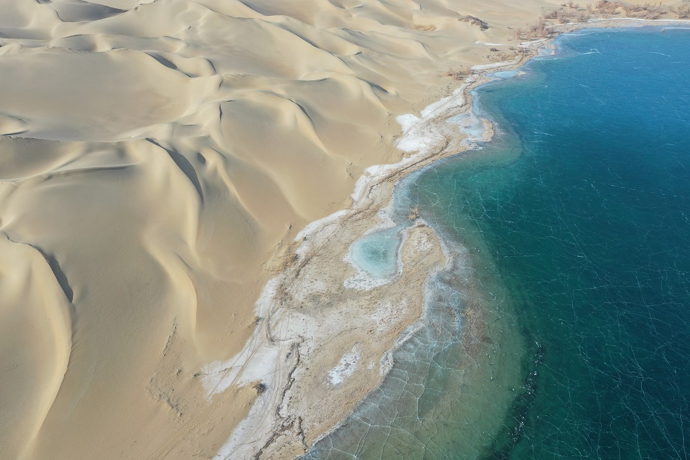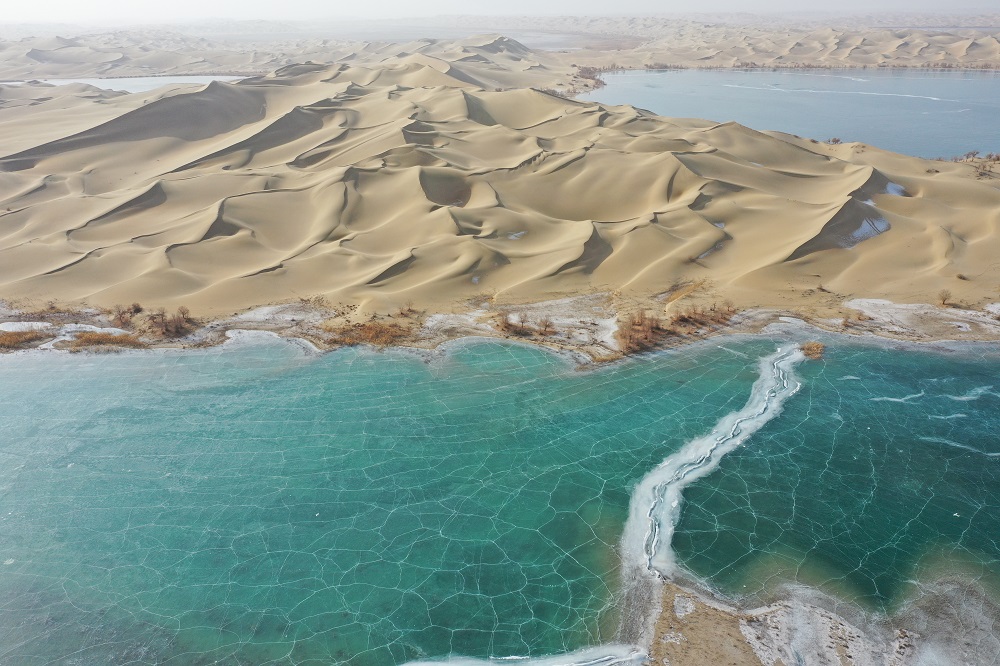 Located in Bayingolin Mongol autonomous prefecture, Xinjiang Uygur autonomous region, frozen Lop Lake resembles a giant green emerald inlayed in the vast desert – a stunning sight indeed.