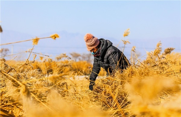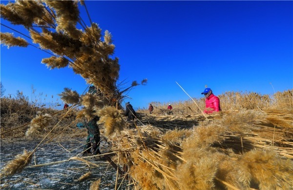 Workers harvested reed in the frozen Shahu Lake, a national 5A-level scenic spot in Shizuishan, Ningxia Hui autonomous region, in early January, to help the plant regrow in spring.