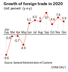 "China's trade growth was mainly pushed by its effective prevention and control of the pandemic last year," said Li Xingqian, director-general of the Ministry of Commerce's Department of Foreign Trade.