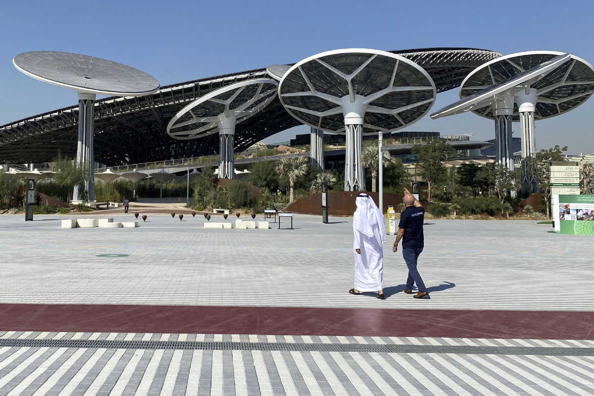 The structure devoted to environmental sustainability rises from the fairgrounds on the desert outskirts of Dubai, where construction workers still scurry around national pavilions in various stages of completion.