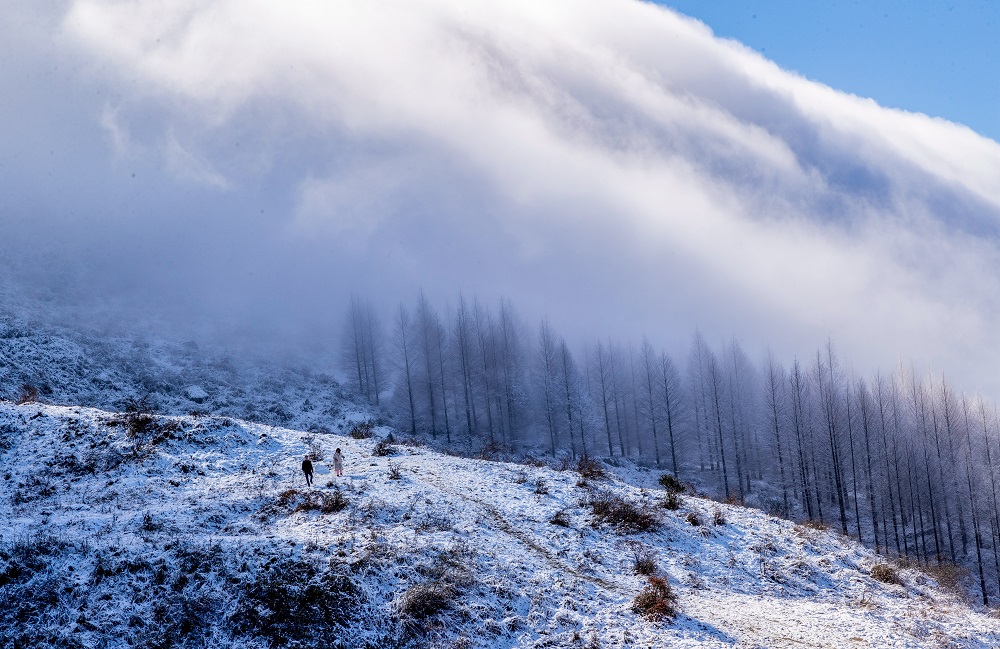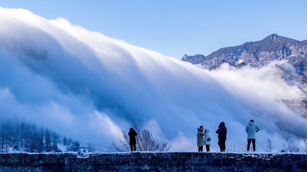 After a heavy snow, a marvelous cloud sea rushes down Jinfo Mountain in Chongqing, churning up white waves along its way and painting a beautiful scroll in this renowned scenic spot of Southwest China.