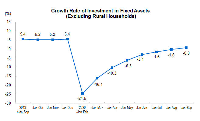 From January to September, China's investment in fixed assets (excluding rural households) reached 43,653 billion yuan ($6,530.49 billion), an increase of 0.8 percent year-on-year, and a decrease of 0.3 percent from January to August. Among them, the investment in private fixed assets was 24,399.8 billion yuan, down 1.5 percent, 1.3 percentage points lower than that from January to August. In terms of month on month rate, fixed asset investment (excluding rural households) increased by 3.37 percent in September.
