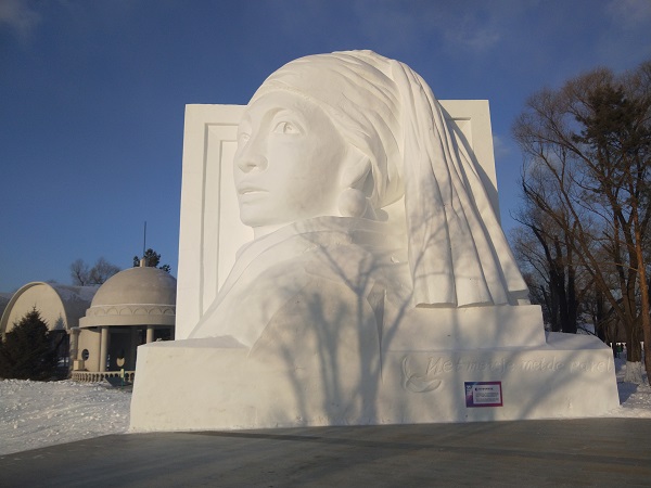 A huge snow sculpture based on the classic painting Girl with a Pearl Earring by Dutch Golden Age artist Johannes Vermeer (circa 1665) attracted lots of tourists recently at the 33rd China Harbin Sun Island International Snow Sculpture Art Expo in Harbin, Heilongjiang province.