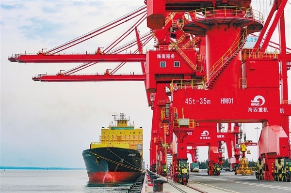 A cargo ship is docked at Yangpu Port Xiaochantan Pier. [Photo/Hainan Daily]