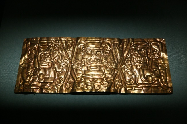 A gold sheet with repousse representations of three fanged figures (1300BC -500BC). [Photo provided to chinadaily.com.cn]