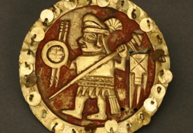 A gold earspool showing a warrior with arms (100-700). [Photo provided to chinadaily.com.cn]