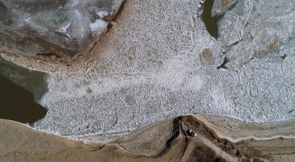 Seen in aerial photos, a floating patchwork of ice meanders down the Yellow River in Helan county, Ningxia Hui autonomous region. [Photo provided to chinadaily.com.cn by Li Jing]