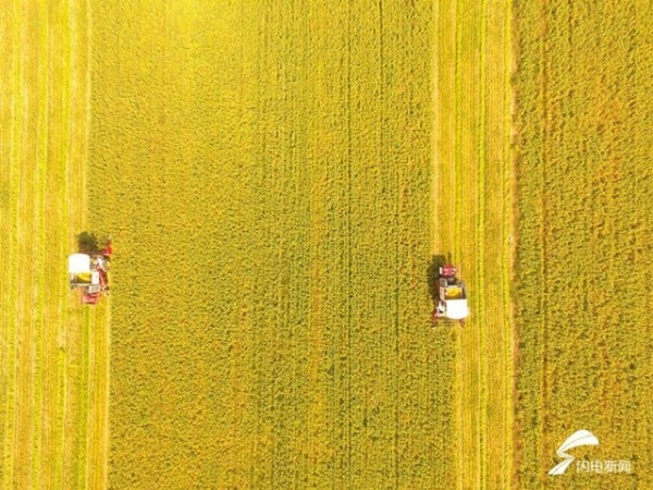 An aerial photo shows wheat harvest season in Shandong province. [Photo/iqilu.com]