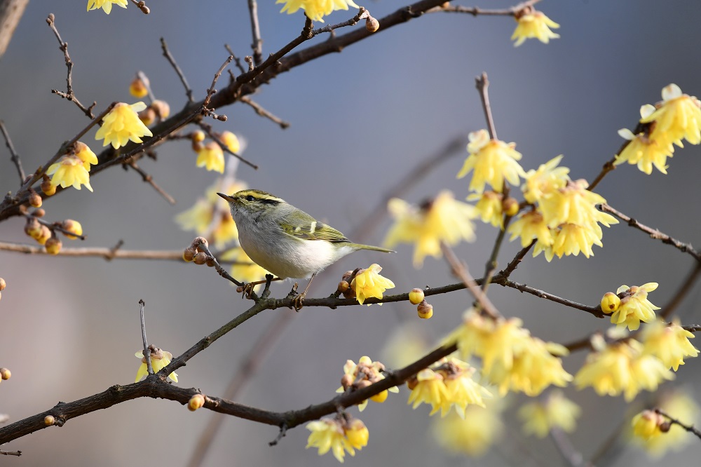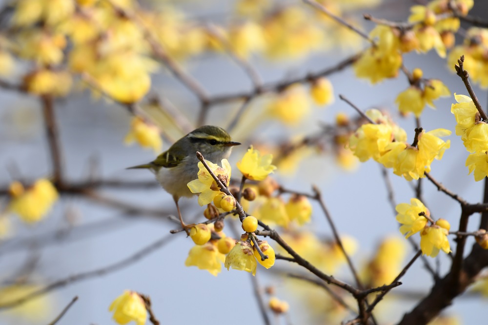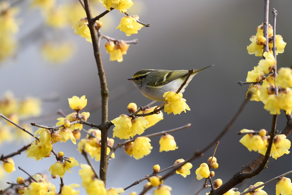A willow warbler lingers on a blooming wintersweet twigs in Renhuai, Southwest China’s Guizhou province in an infinite reverie about the coming of spring.