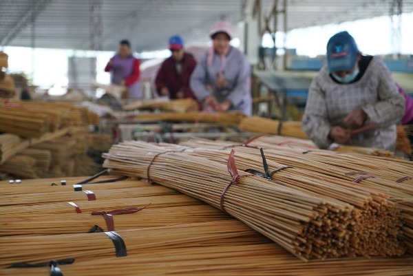 Workers bundle bamboo strips at a bamboo processing company in Hushi town in Chishui, Southwest China's Guizhou province, Jan 23, 2021. [Photo/Xinhua]