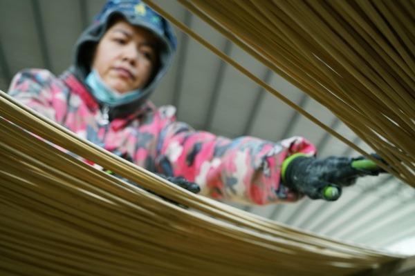 A worker screens bamboo strips at a bamboo processing company in Hushi town in Chishui, Southwest China's Guizhou province, Jan 23, 2021. [Photo/Xinhua]