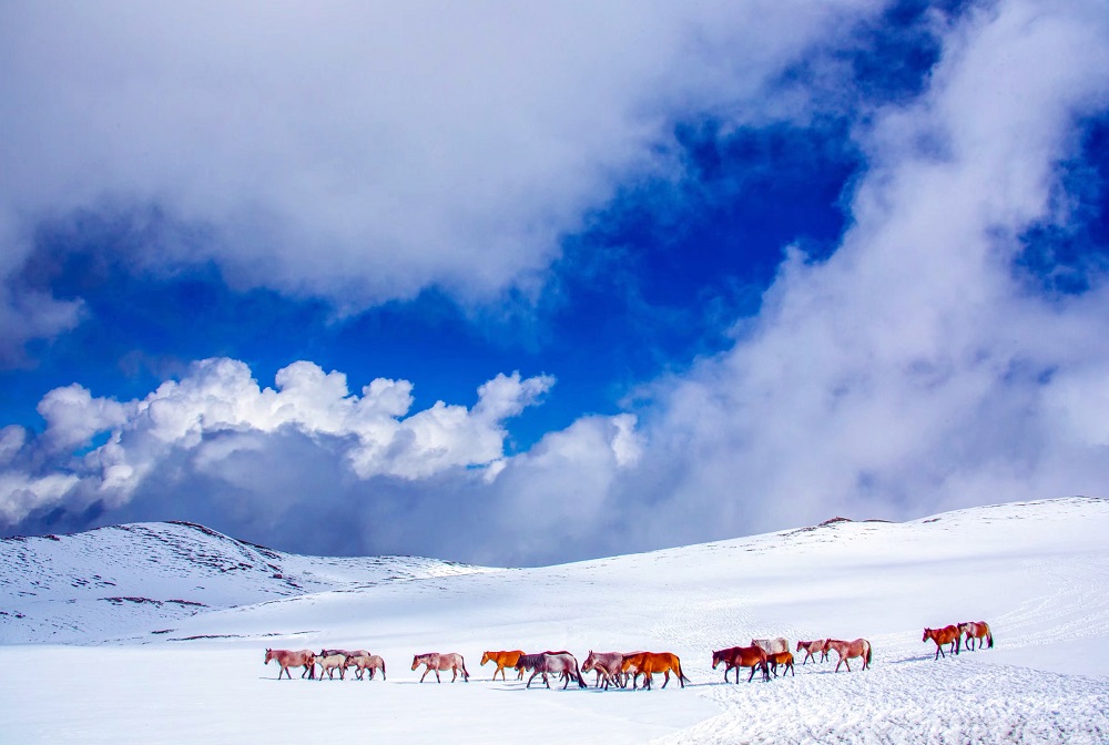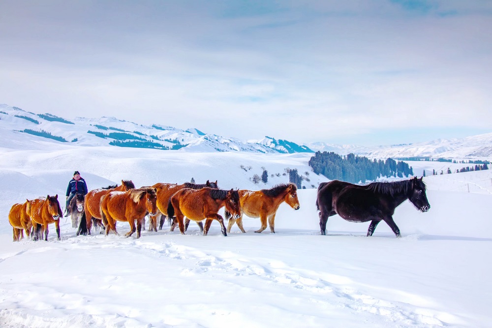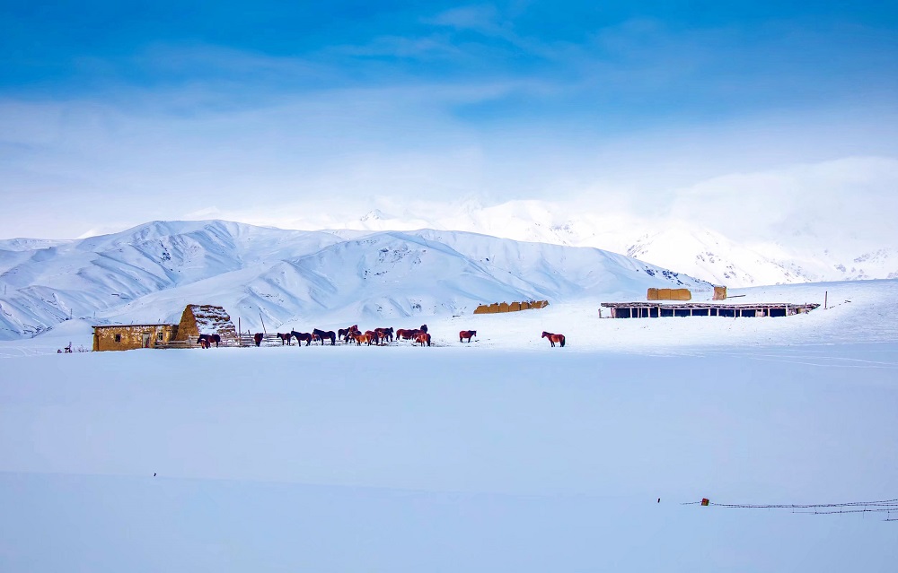 Under an azure sky, the snow-covered Nanshan grassland in Ili Kazak autonomous prefecture, Xinjiang Uygur autonomous region, presents fantastic nomadic scenes with shepherds, horses and characteristic landscapes, intoxicating people with its beauty.