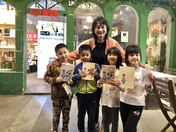 Song Anna, author of Memorabilia in the Earth, poses with children holding her book at a bookstore in Chengdu, Sichuan province, in April 2019.[Photo provided to China Daily]