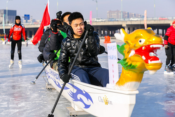 A dragon boat race is carried out on the ice in Hohhot, Inner Mongolia, Dec 19. According to officials from the municipal sports bureau, most ice and snow fields in Hohhot are open for free, and residents are welcome to experience the different sports. [Photo/cfp.cn]