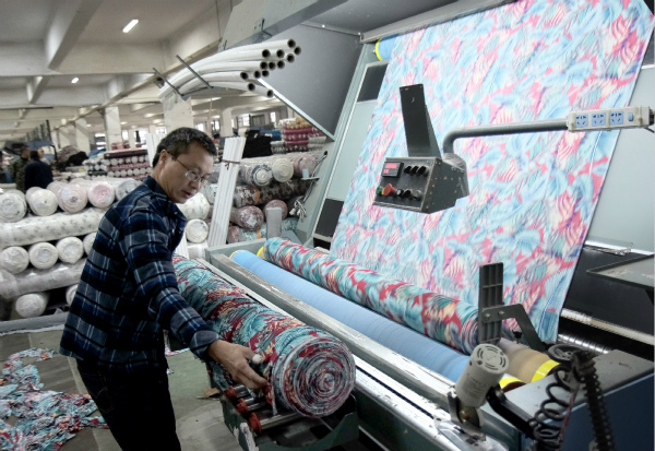 An employee wraps fabric at Zhejiang ESSE Textile Technology Co Ltd in Shaoxing, Zhejiang province on Nov 25, 2020. [Photo by Xiao Da/China Daily]