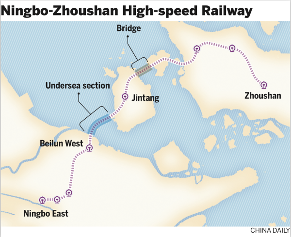 The line's 16.18-km undersea tunnel from Ningbo to Jintang Island in Zhoushan will be the longest undersea high-speed rail tunnel in the world, while its 3.1-km Xihoumen Rail-Road bridge will be the longest in the world upon its completion.