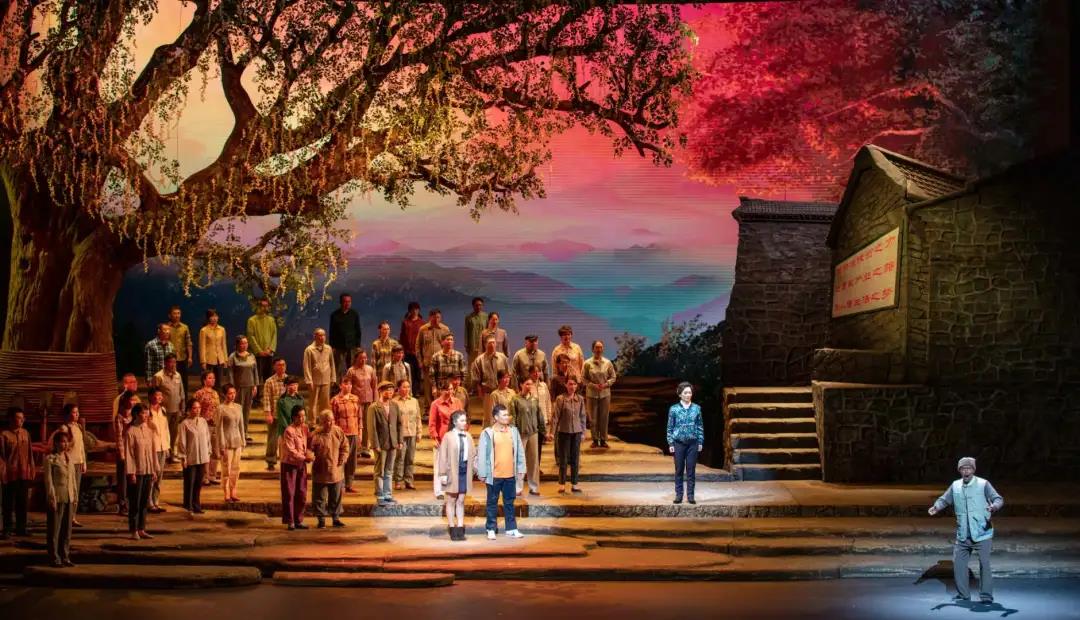 The set design presents a strongly realistic style, with lifelike props including mountains, the stone road and the big locust tree. For the spatial performance of the village, a zigzag road is used as the main area with changes to the front and back scenes, creating a free and natural atmosphere. A cambered LED screen is also set to facilitate the changing scenery.