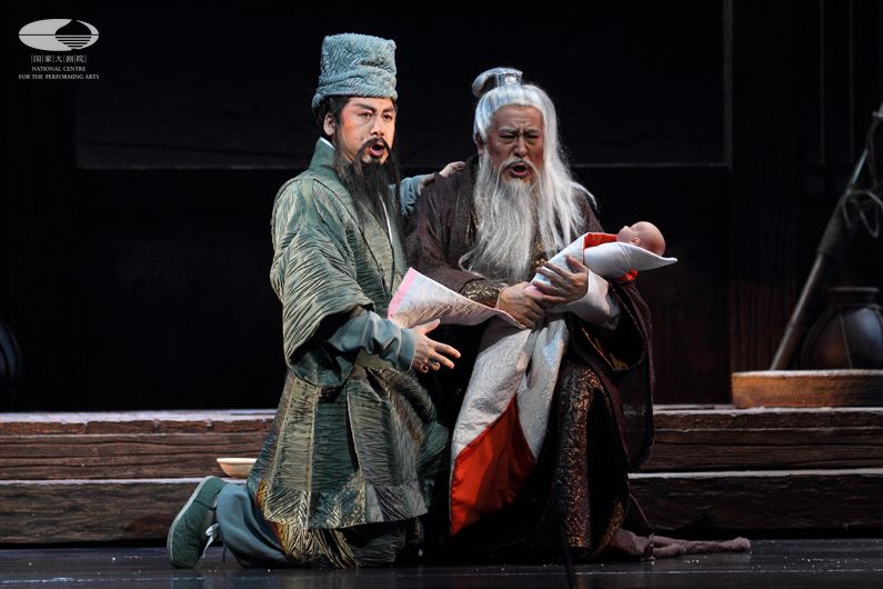 Ingeniously set, the stage of the opera consists of a raked platform and a model of a cottage with a well, resembling an idyllic ink-painted scroll that hints at an abstract aesthetic pursuit. Costumes and make-ups of the main roles are all designed to reflect their characters: white hair and long robes adorn the wise old man Gongsun Chujiu; black green is chosen for forbearing Cheng Ying; golden armor clad brave Han Jue who also sacrifices his life to protect the baby; and an elegant long pink dress with exquisite embroideries marks the presence of Zhuangji.