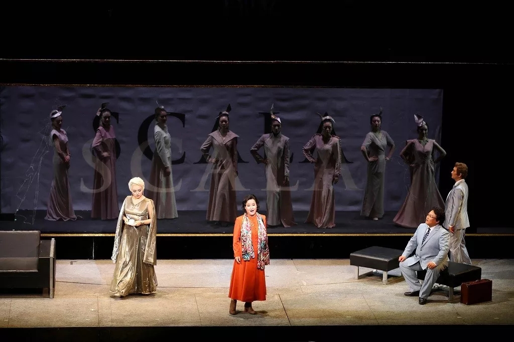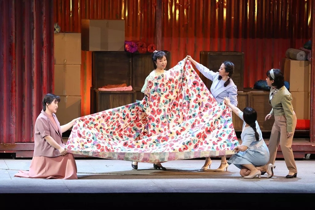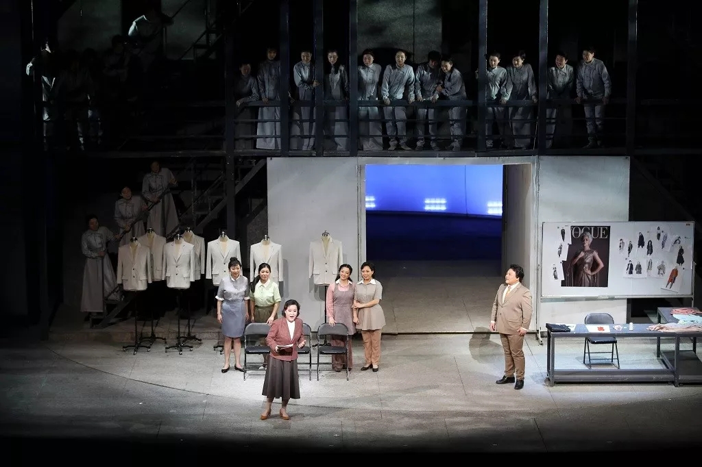 First appearing in the prelude, the enchanting theme melody The Tune of the Female Embroiderer is featured seven to eight times with subtle changes throughout the opera. It plays a crucial function in linking major scenes and strengthening the theme. For instance, when Zhao and her friends express their dream to create a fashion brand, the song leads into the actresses’ performance of The Yearn of a Button. The transition smoothly and clearly illustrates their transformation from migrant laborers to entrepreneurs. Mrs Scala, another important role, comes out during this moment and has a conflict with Zhao. Her excellent coloratura arias bring this arrogant and aggressive figure to life.