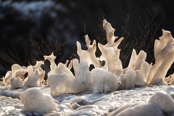 Magical scenes of so-called "ice dams" recently appeared alongside the dammed lakes in Dishuiyan, Hohhot, with miraculous ice formations taking shape deep inside the canyons. [Photo/VCG]