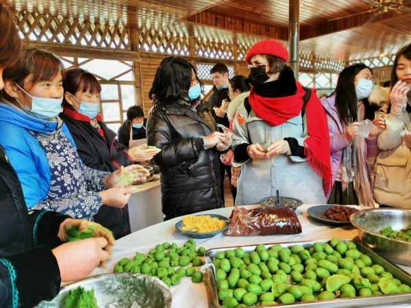 Students from abroad make sweet green rice balls in Dayan township of Ningbo, Zhejiang province on Jan 27, 2021. [Photo by Shi Jingjing/Provided to chinadaily.com.cn]