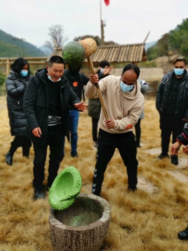 Students from abroad make sweet green rice balls in Dayan on Jan 27, 2021. [Photo by Shi Jingjing/Provided to chinadaily.com.cn]