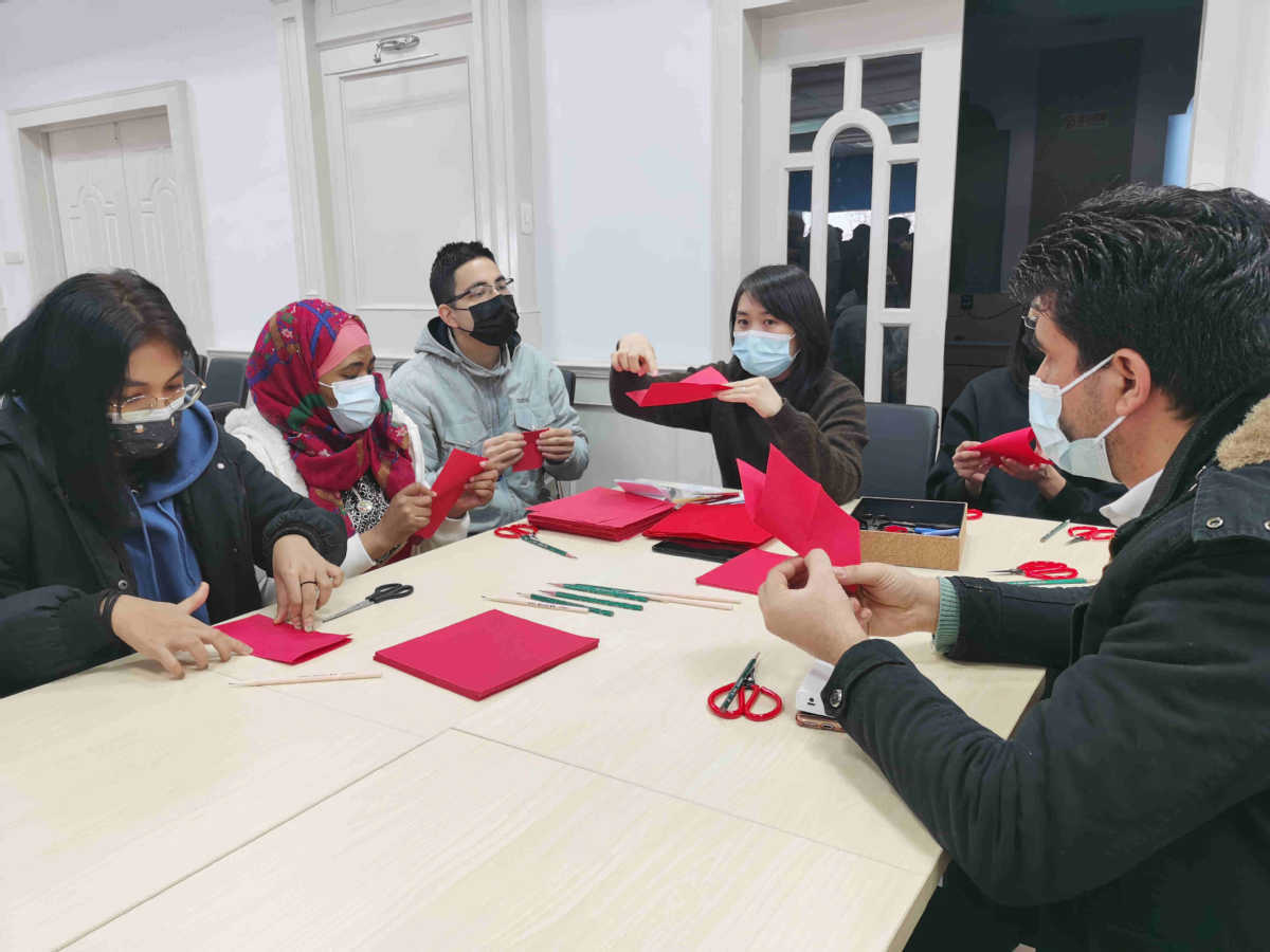 Foreign students learn paper cutting for window decorations, a traditional custom celebrating the Spring Festival in China. [Photo provided to chinadaily.com.cn]