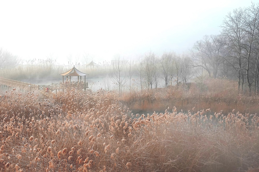 Reeds veiled with rime in the morning mist at the Niukouyu Wetland Park in Fangshan district, southwestern Beijing [Photos/IC]