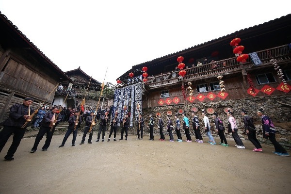 Miao villagers perform a traditional Lusheng dance in the Miao village of Jijia in Zhengguang village, Danzhai county, Southwest China's Guizhou province. [Photo by Huang Xiaohai/For chinadaily.com.cn]